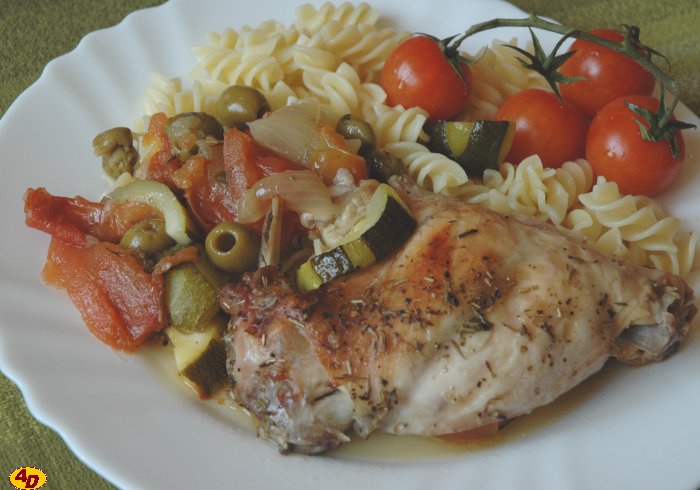 Všechnu zeleninu si nejdříve očistíme a opláchneme. Cibuli nakrájíme na půlkolečka, cuketu na kolečka, česnek prolisujeme, rajčata spaříme a oloupeme a nakrájíme na čtvrtky. Králičí maso omyjeme, osušíme a naporcujeme. Na dvou lžících oleje ho osmahneme po všech stranách. Vložíme ho do pekáčku, obložíme ho cibulí, cuketami, rajčaty a olivami, posypeme prolisovaným česnekem a provensálským kořením a podlijeme zbylým olejem. Vložíme do předehřáté trouby a pečeme asi 45 minut při 175 stupních C. Během pečení podléváme bílým vínem, do kterého jsme si přimíchali pomerančovou a citronovou šťávu. Podáváme s nasucho opečenými vařenými brambory.