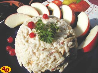 Celer a jablka oloupeme, rychle drobně nakrájíme a smícháme s majonézou, hořčicí, solí a cukrem. Přidáme jemně nasekané kuřecí maso, dobře promícháme a dochutíme solí, pepřem a cukrem. Na míse obkládáme podle možnosti rajčaty, hlávkovým salátem, plátky žampiónů apod. Salát servírujeme dobře vychlazený.
