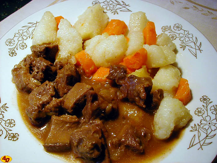 Jako přílohu můžeme použít bramborové knedlíky – v našem případě chlupaté knedlíky. Ty připravíme dle návodu na obalu a necháme je vychladnout. Mrkev očistíme, nakrájíme nahrubo a povaříme v osolené vodě s malým kouskem másla asi 7 minut. Necháme také zchladnout. Těsně před servírováním guláše rozpálíme na pánvi asi lžíci másla a chlupaté knedlíky promíchané s mrkví na něm opečeme.