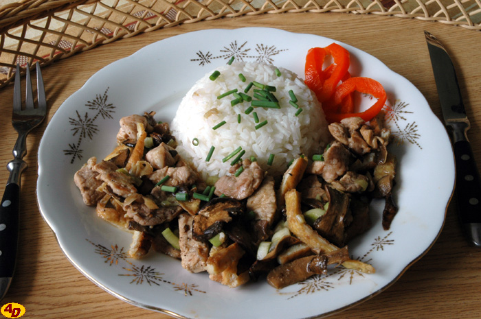 Sušené houby spaříme horkou vodou a necháme asi hodinu nabobtnat. Poté je zcedíme, mírně vymačkáme vodu a je-li třeba, pokrájíme je na menší kousky. Maso nakrájíme na tenké plátky o velikosti asi 2 x 3 cm, posypeme ho solamylem, zázvorem, mletým pepřem a muškátovým květem, pokapeme ho polovinou sojové omáčky, promícháme a necháme půl hodiny odstát. Zatím si z rozšlehaných vajec na jedné lžíce oleje usmažíme omeletu, necháme ji vychladnout a nakrájíme ji na nudličky. Na pánev přidáme další lžíci oleje a rychle na ni osmahneme houby a dáme je stranou. Na pánev opět přidáme lžíci oleje a osmažíme plátky česneku spolu s naloženým masem. Asi po 3 až 4 minutách, kdy maso rovnoměrně zhnědne, přidáme houby a nakrájenou omeletu, vše pokapeme zbývající sojovou omáčkou a za stálého míchání ještě asi minutu smažíme. V pokrmu by neměla být řídká šťáva. Podáváme s rýží.