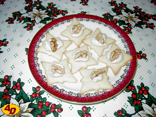 Suroviny na těsto zpracujeme rukama v míse nebo na vále. Hladké těsto zabalíme do fólie a necháme odležet asi hodinu v chladnu. Poté jej rozválíme na plát na pomoučeném vále, vykrajujeme z něj kolečka o průměru asi 3 cm a dáme je péci do vyhřáté trouby. Mezitím si z bílků a cukru ušleháme tuhý sníh a promícháme jej s nastrouhanými ořechy. Poloupečená koečka vytáhneme i s plechem z trouby a rychle na ně děláme kupičky ze sněhové hmoty. Na každý kopeček přimáčneme půlku vlašského ořechu. Takto ozdobená kolečka dáme dopéct (nebo spíše dosušit) do trouby - teplotu snížíme na 170 stupňů. Po upečení sesuneme z plechu, necháme vychladnout. Skladujeme v chladnu a suchu. Pečivo je lepší až po několika dnech.