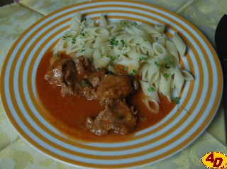 Do kastrolu dáme 50 g másla, 40 g strouhané cibule, necháme lehce zpěnit, cibulku zežloutnout, přidáme lžičku sladké papriky, osolené telecí maso nakrájené na hrubší kostky a lžičku drobně sekaných kaparů. Podlijeme asi 100 ml vývaru a dusíme do měkka asi 3/4 hodiny.