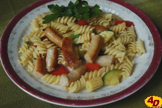 Dáme si vařit těstoviny podle návodu na obalu. Bílou klobásu opečeme na oleji a pokrájíme na kousky (zhruba ve velikosti kousků kukuřiček). Zvlášť krátce opečeme i cuketu a papriky. Vše zamícháme do uvařených těstovin a podáváme.