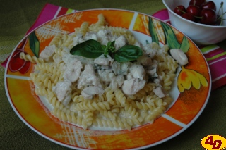Začínáme tím, že si dáme vařit potřebné množství osolené vody na těstoviny. Potom si připravíme všechny suroviny, cibuli a česnek oloupeme a nakrájíme. Kuřecí prsa nakrájíme na proužky. Na rozpáleném malém množství olivového oleje orestujeme cibuli, přidáme maso, česnek na plátky, osolíme a opepříme. Po chvíli podlijeme bílým vínem a asi 10 minut dusíme. Potom přidáme smetanu, do které jsme vmíchali sušenou (asi 1/2 lžičky) nebo čerstvou nasekanou bazalku (asi 1 lžíce). Společně ještě asi 5 minut dusíme. Odstavíme ze zdroje tepla.