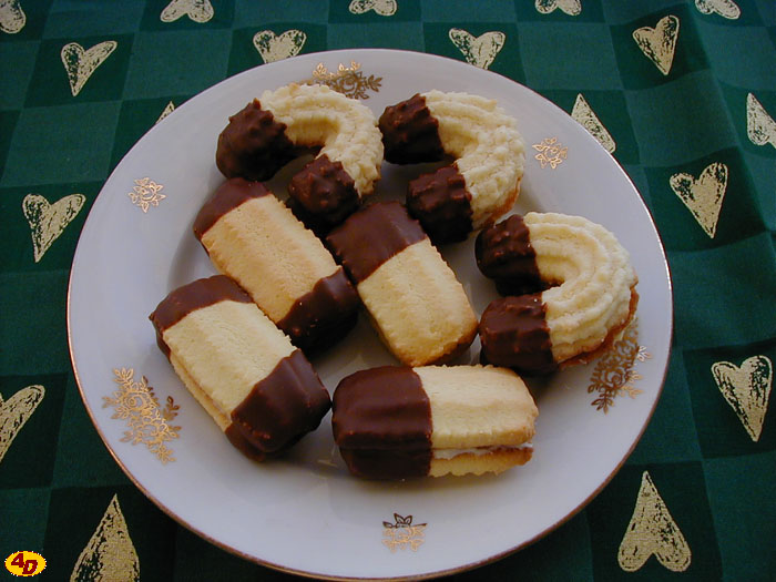 Všechny suroviny rukama zpracujeme ve stejnorodé těsto. Necháme je asi hodinu odpočinout v chladnu. Potom tvarujeme tyčinky pomocí strojku. Klademe je na vymaštěný plech a pečeme ve středně vyhřáté troubě. Vychladké tyčinky slepujeme zavařeninou (máslovým krémem). Můžeme je také ozdobit nepravidelnými čárkami čokolády (použijeme například jemný štětec, který v čokoládě namáčíme a lehkými tahy zdobíme těsně vedle sebe položené tyčinky).