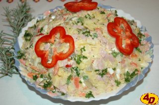 Pokud máme kvalitní brambory, pečlivě je umyjeme, nejlépe kartáčkem a dáme se vařit ve slupce. Jinak samozřejmě dáme vařit oloupané brambory- Poté si dáme vařit vajíčka na tvrdo. Očistíme mrkev, nakrájíme na kostičky a také ji chvíli povaříme ve slané vodě. Vody na mrkev dáme poměrně málo, trochu ji osolíme a přidáme kousíček másla. Mrkev by měla zůstat spíše tvrdší. Používáme-li zmražený hrášek (je docela dobré ho mít po ruce v mrazáku), dáme ho také na pár minut povařit do slané vody. Vajíčka uvařená na tvrdo oloupeme a nakrájíme na kráječi. Kyselé okurky také nakrájíme na kostičky. Uvařené a vychladlé brambory oloupeme a pomocí protlačovacího sítka nakrájíme na hranolky. Salám také nakrájíme na kostičky, rovněž cibuli oloupeme a nakrájíme. Suroviny, které připravujeme, dáváme do "pracovní" salátové mísy, která bude sloužit pouze k míchání salátu. Musí být dostatečně velká, abychom při míchávání neměli problémy s místem. Nakonec přidáme vlašský salát, majolku a jogurt, plnotučnou hořčici,trochu posolíme, malinko popepříme a vařečkou zamícháme. Mícháme ovšem pouze tolik, aby se suroviny rovnoměrně promísily, neměly by se však "rozmazávat". Poté salát ochutnáme a případně dochutíme - počítáme však s tím, že bude mít výraznější chuť za dvě až tři hodiny. Jsme-li s chutí spokojeni, lze salát přemístit do mísy, ve které jej budeme servírovat a samozřejmě ozdobit. Ke zdobení můžeme použít např. kolečka rajčat, proužky papriky, kolečka salámu či plátek vajíčka uvařeného natvrdo nebo kyselou okurku.