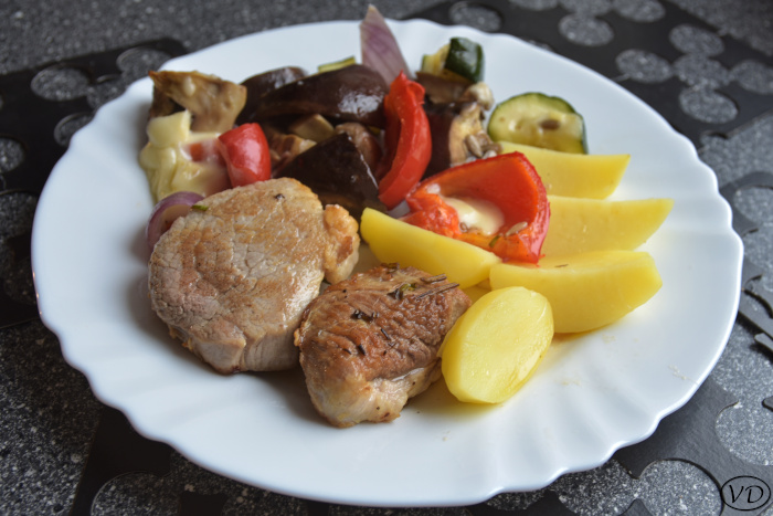 Mezitím se věnujeme přípravě panenky. Medailonky krátce opečeme na pánvi po obou stranách. Pak je přesuneme do zapékací misky, přidáme výpek z pánve a vložíme do trouby asi na 10 minut. Ideálně na posledních 10 minut se zeleninou.
