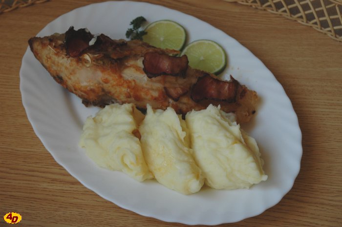 Z kapra si připravíme porce (podrobnosti ke zpracování kapra najdete u receptu na smaženého kapra) a osolíme je. Asi dvě třetiny dávky slaniny nakrájíme na drobné kostičky a necháme rozpustit v pekáčku na co nejmírnějším ohni. Cibuli oloupeme a pokrájíme na kolečka, přidáme do pekáčku a po chvíli odstavíme. Jednotlivé porce kapra potřeme po obou stranách prolisovaným česnekem a slabou vrstvou hořčice a obalíme je ve směsi hladké mouky a papriky. Vložíme je do pekáčku s rozpuštěnou slaninou a cibulí a zapékáme v mírně vyhřáté troubě asi 15 minut. Poté porce ryby obrátíme, poklademe zbývajícími plátky slaniny a pečeme dalších 15 minut. Jako přílohu použijeme nové brambory nebo bramborovou kaši.