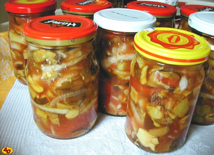 Výběru hub na salát věnujeme patřičnou pozornost - samozřejmě by mělo jít o houby zdravé, tvrdší. Houby očistíme, nakrájíme na větší kousky (hezky vypadají i plátky), propláchneme studenou vodou a dáme vařit do men?ího mno?ství trochu osolené vody. Vaříme asi 3 minuty, potom houby zcedíme a propláchneme studenou vodou. Z uvedených surovin si připravíme nálev, necháme ho svařit a po zchladnutí ho přecedíme (koření odstraníme). Očistíme si cibuli a papriky a obojí nakrájíme. Cibuli na půlkolečka, papriku na proužky. Už v tomto okamžiku je nám jasné, že na míchání salátu budeme potřeboval hodně velkou nádobu. Dáme do ní zchladlé houby, nakrájené papriky a cibuli, přidáme kečup a rajčatový protlak (máme-li přebytek měkkých rajčat, můžeme je pokrájet a dát místo protlaku), cukr a olej. Přidáme zchladlý nálev a všechno dobře promícháme. Plníme do dobře vymytých a usušených sklenic a stlačujeme lžící tak, aby v salátu nevznikaly žádné vzduchové bubliny. Sklenice by měly být naplněné asi jeden centimetr pod okraj. Potom sklenici zavíčkujeme a sterilujeme 30 minut při 85 stupních celsia. Salát necháme ještě nejméně týden uzrát a teprve potom ho spotřebováváme. Je to vhodná příloha k masitým jídlům, k těstovinám, ale chutná i samostatně nebo s černým pečivem.