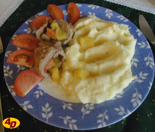 Telecí plátky lehce naklepeme, osolíme a opepříme po obou stranách a po jedné straně tence potřeme hořčicí. Slaninu, salám a cukety nakrájíme na špalíčky dlouhé asi 5 cm, naklademe je na plátky masa a zabalíme jako závitky. Upevníme jehlou na závitky nebo nití. Zbylou cuketu nakrájíme na kostičky. Na pánvi rozpálíme olej a závitky na něm rychle osmahneme na všech stranách. Předáme je do pekáčku a na oleji ještě osmahneme zbylou cuketu. Přidáme ji také do pekáčku. Zbylý olej přelijeme také do pekáčku, v případě potřeby ještě podlijeme trochu vodou a dáme péct do trouby. Nepečeme dlouho, občas kontrolujeme a otáčíme. Jakmile je maso měkké, přidáme do šťávy kousek másla a necháme ho rozpustit. Šťávu promícháme. Podáváme s bramborovou kaší, bramborem nebo rýží a čerstvou zeleninou. Je to lehké, jednoduché jídlo.