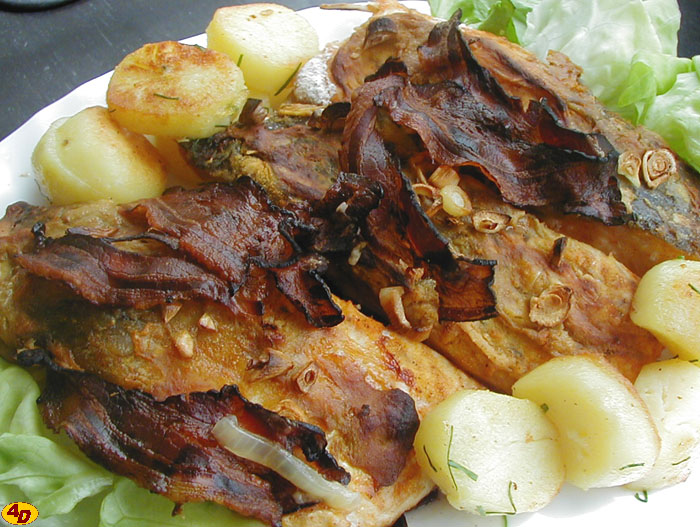 Kapra očistíme, opláchneme a nakrájíme na porce. Každý kousek z obou stran lehce potřeme solí a obalíme ve směsi hladké mouky, papriky a chilli koření. Polovinu anglické slaniny nakrájíme na proužky a rozškvaříme na pekáčku. Zatím si oloupeme cibuli a nakrájíme na kolečka, která navršíme na rozpuštěnou anglickou slaninu. Na to položíme obalené porce kapra, každou potřeme po povrchu lžičkou plnotučné hořčice, posypeme nakrájeným česnekem a překryjeme plátkem anglické slaniny. Pečeme v mírně vyhřáté troubě asi 45 minut. Podáváme s opečenými nebo vařenými brambory a doplníme zeleninovou oblohou nebo zeleninovým salátem.