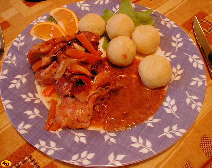 Nejdříve si kuře opláchneme, osušíme a rozporcujeme. Můžeme také použít kuřecí stejky nebo krůtí prsa (ta nakrájíme na větší hranolky). Očistíme si mrkev, celer a česnek a nakrájíme vše na malé hranolky. Těmi "prošpikujeme" kousky masa. Maso mírně osolíme a posypeme tymiánem. Každý kousek masa obalíme anglickou slaninou (pomůžeme si jehlou na závitky) a vložíme do pekáčku, který jsme vytřeli na dně a po stranách máslem. Posypeme případnými zbytky nakrájené zeleniny, přidáme všechno zbývající koření a mírně podlijeme vodou. Pekáč vložíme přikrytý do trouby a pečeme. Občas kontrolujeme a podléváme červeným vínem. Když je maso měkké a na povrchu zčervená, vyjmeme ho z pekáče a dáme stranou. Ze zbylé šťávy vyjmeme koření a zahustíme ji brusinkovým džemem. Podáváme s malými bramborovými knedlíčky nebo s noky. Na talíři doplníme plátky pomeranče nebo opečenými plátky jablek.